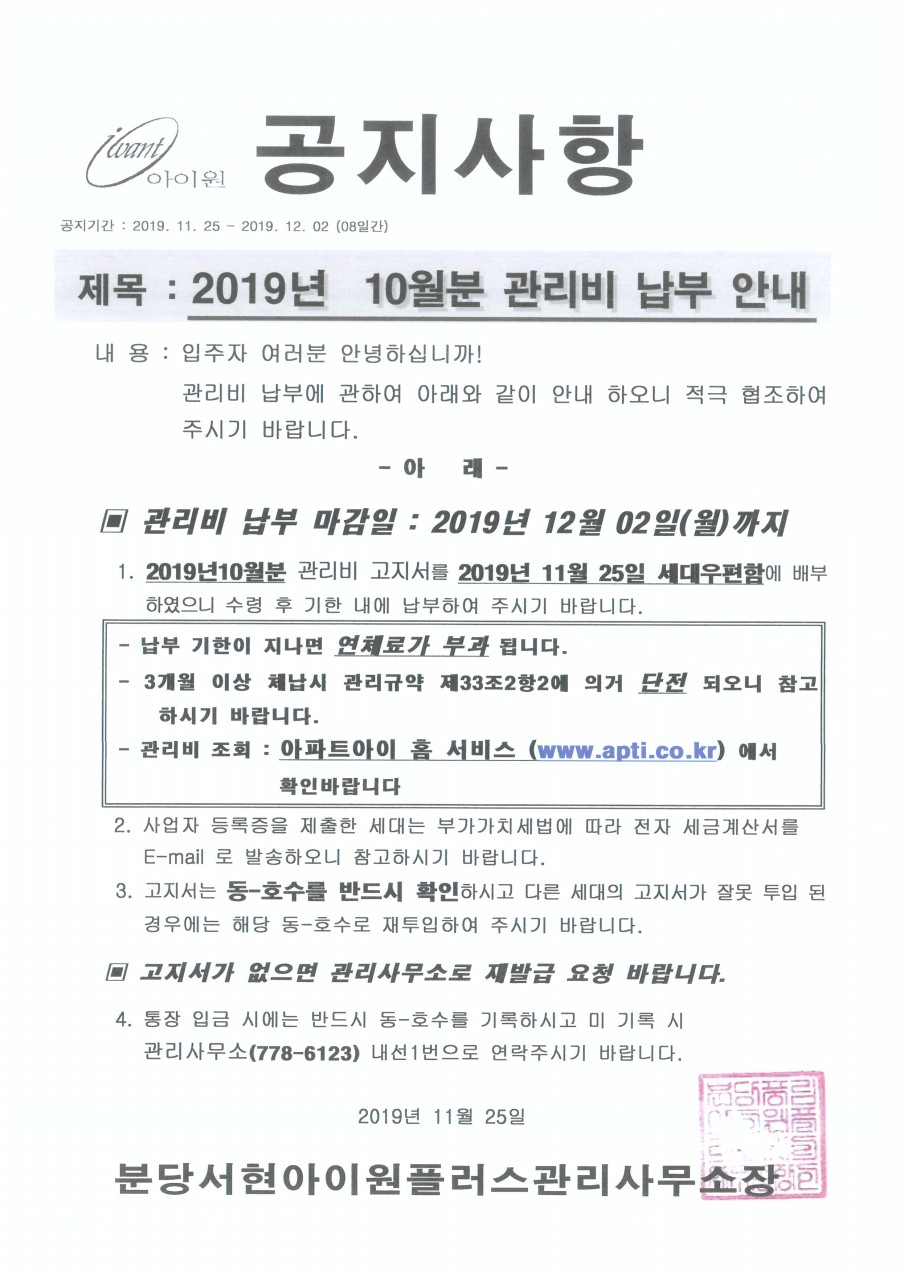 2019³â 10¿ùºÐ °ü¸®ºñ ³³ºÎ ¾È³» |
